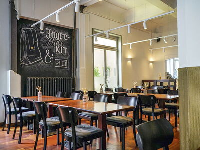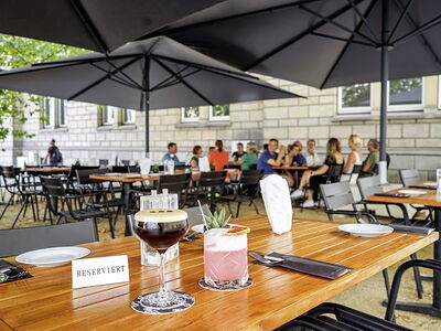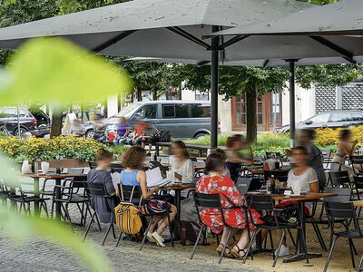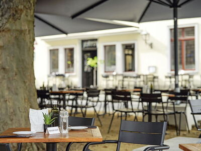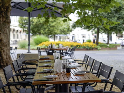 Wir haben einen sehr schönen, weitläufigen Außenbereich mit 120 Plätzen – direkt vor der Tür oder unter schattenspendenden Bäumen mit Blick auf den Ziegenmarkt.